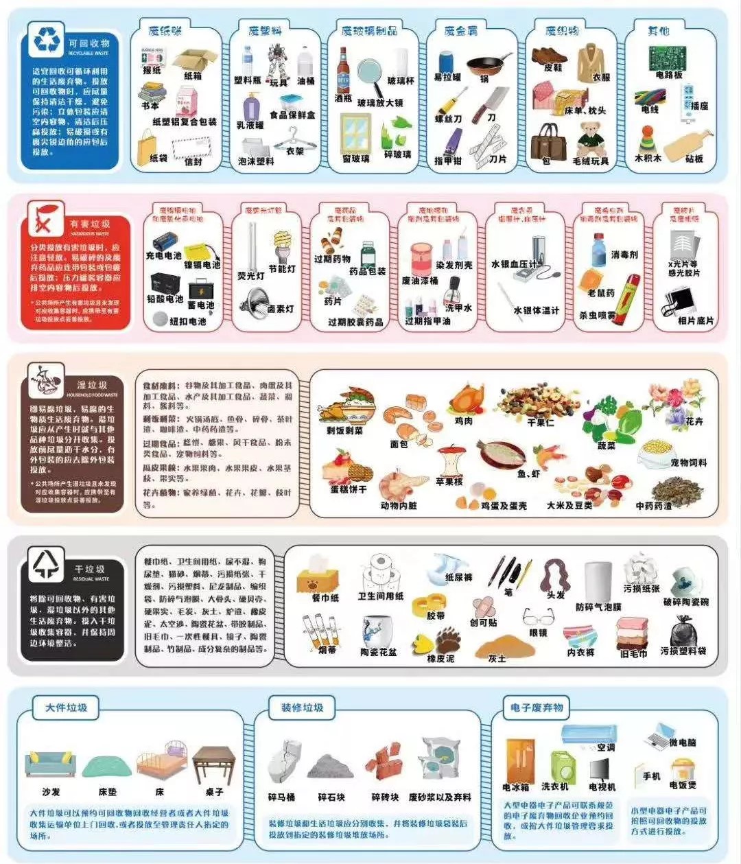 按照可回收物、有害垃圾、干垃圾和濕垃圾的生活垃圾四分類法進(jìn)行垃圾分類。