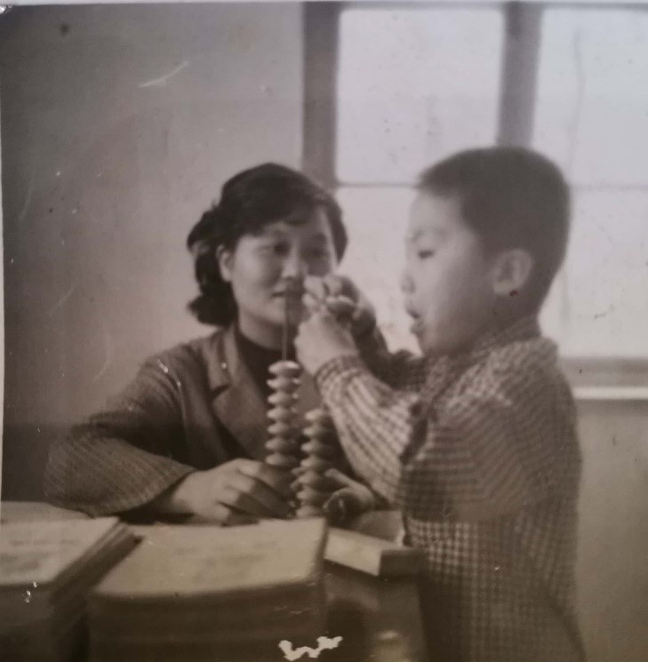 在這張泛黃的老舊照片上,老師孫毅眼神充滿(mǎn)關(guān)懷,手把手地教導(dǎo)著一年級(jí)的孔慶偉擺弄教具上的珠子。小朋友神情專(zhuān)注,微微張開(kāi)的嘴巴似乎急切著想解開(kāi)教具上謎題。